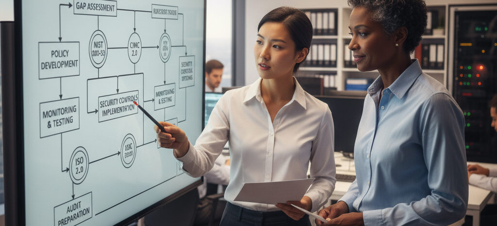 Compliance & Audit Readiness We guide your organization through frameworks like NIST 800-53, CMMC 2.0, ISO 27001, and industry-specific requirements. Our step-by-step compliance roadmap ensures you know exactly where you stand and what’s next — from gap assessment to full audit preparation.